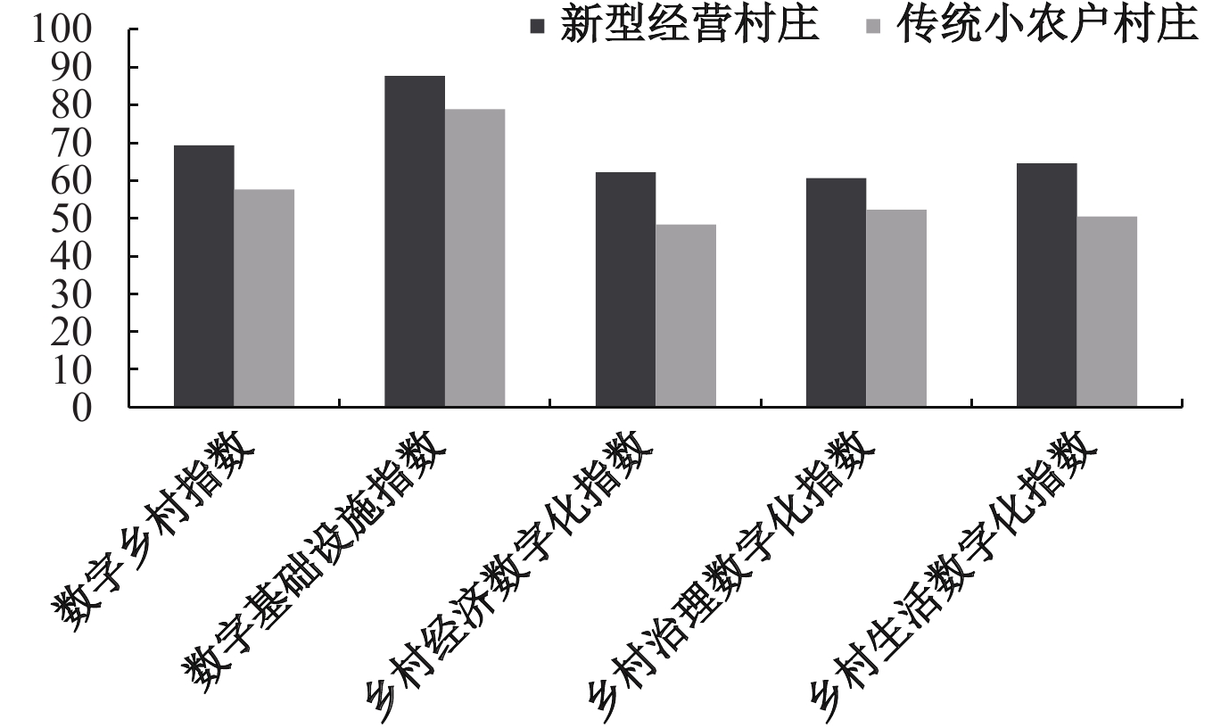 2. 解释变量。本文采用“县域数字乡村指数”作为数字乡村发展水平的代理变量,该指数全面衡量了全国县级行政单位的数字乡村发展水平。图2展示了样本村庄的数字乡村指数及其四个子指数。可以看出,新型农业经营村庄的数字乡村指数及其四个子指数均显著高于传统小农户经营的村庄。这一描述性特征为本文探究数字乡村发展对农业经营转型的影响提供了现实依据。