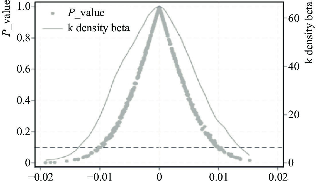 为了验证实验组企业和对照组企业的智能化转型确实是由增值税留抵退税政策导致的,而不是由其他偶然因素或不可观测因素导致的,本文进行了安慰剂检验。具体方法如下:我们采取随机抽样500次,从样本中挑选出与真实实验组企业数量相同的企业作为“伪实验组”,剩余企业为对照组。以企业的人工智能专利数量为被解释变量,回归得到“伪政策”虚拟变量估计系数值,“伪政策”虚拟变量与真实的增值税留抵退税政策虚拟变量无关。将生成的“伪政策”虚拟变量估计系数值绘制在图3中。若“伪政策”估计变量的系数值普遍接近于0且P值大于0.1,则表明本文的回归结果不太可能是偶然因素或不可观测因素导致的。