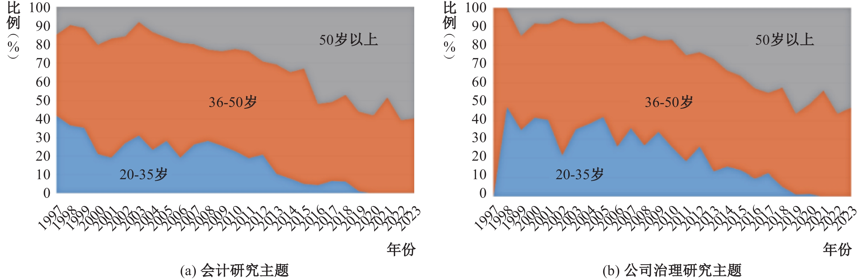 我国《高等教育法》明确规定博士研究生需具备“创造性科学研究工作”能力。由图1可知,会计学者的研究主题自1997年起呈现逐步拓展态势。为探究研究主题拓展与学者年龄及其教育背景的关联,本文对1997—2023年会计学者发文量变化显著的会计和公司治理两个研究主题,按论文发表年份统计了学者年龄分布的演变情况。