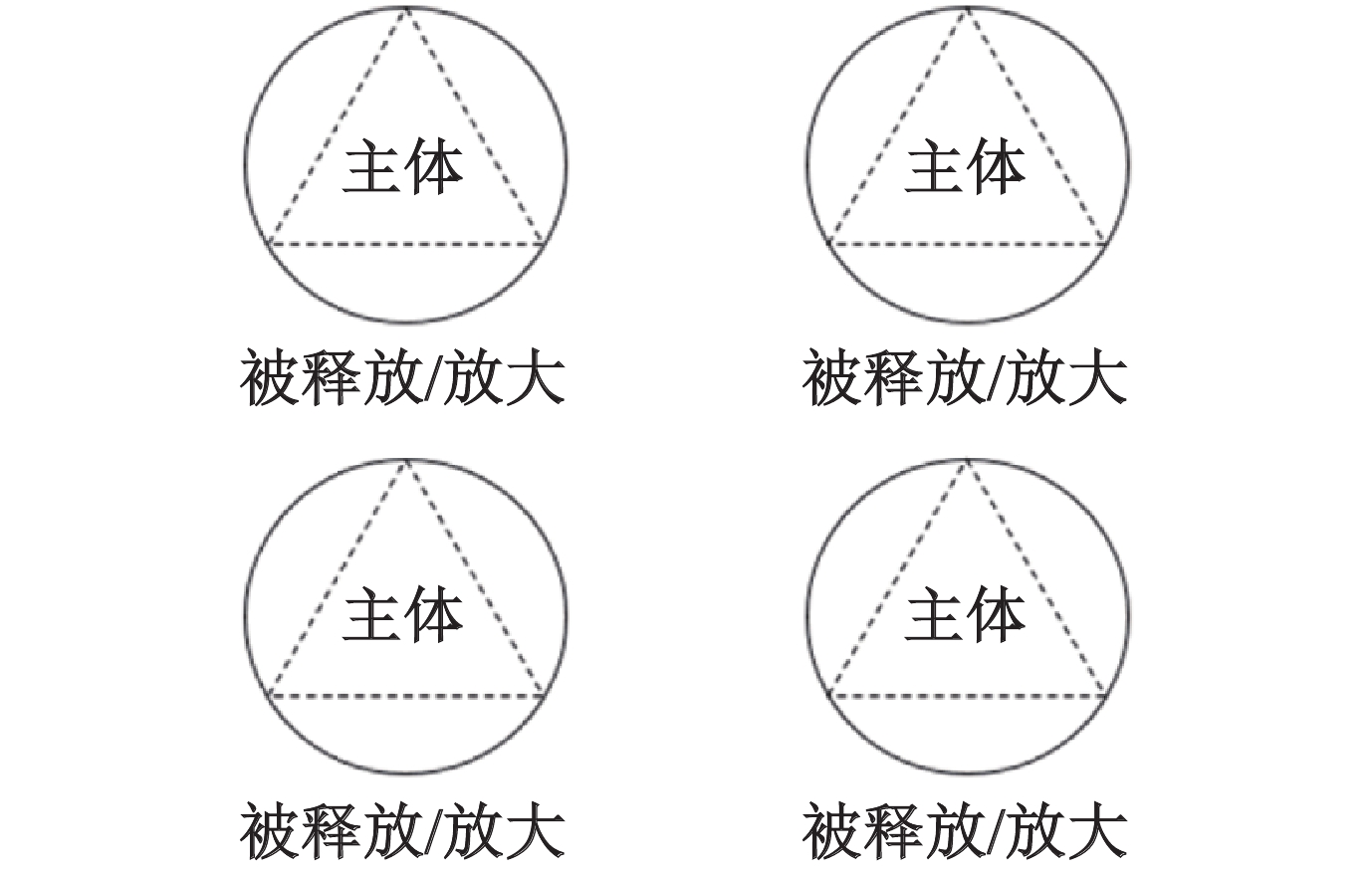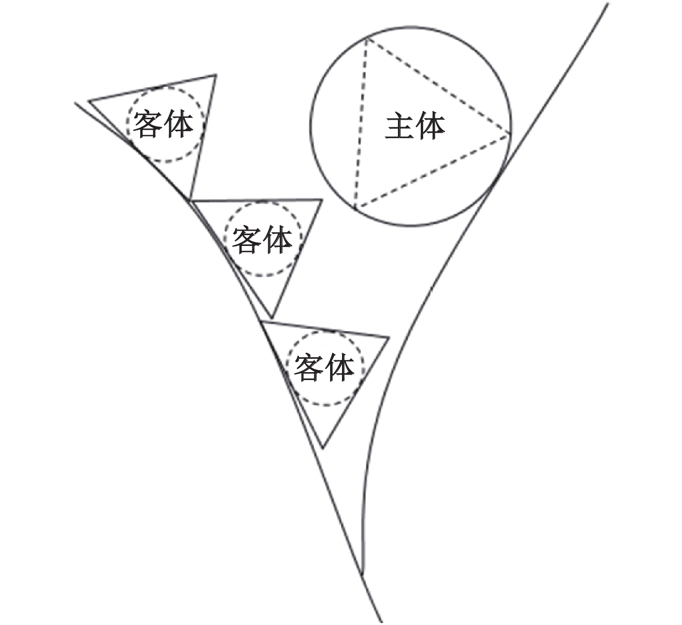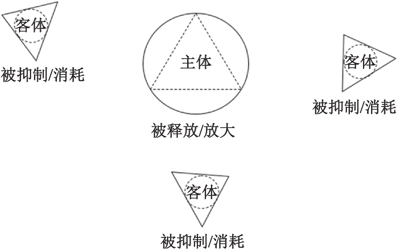 | 注:实体圆镶套虚线三角表示主体,实线三角镶套虚线圆表示客体。其中,“实线圆套虚线三角实线”大于“三角套虚线圆”表示在这个场域中客体化了的主体,其能量是被压制的或被损耗的。 图 1-1 主体客体化 |