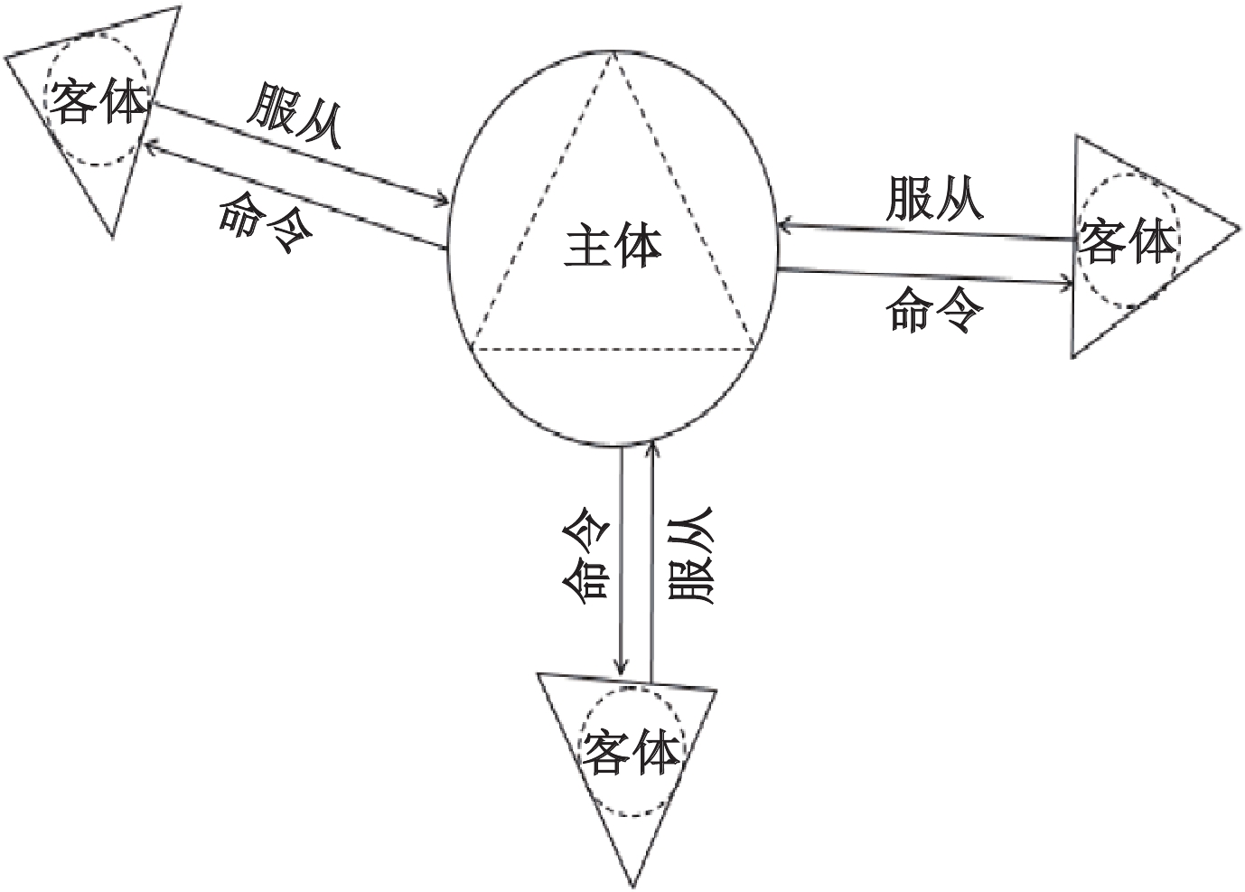 | 注:实体圆镶套虚线三角表示主体,实线三角镶套虚线圆表示客体,单向箭头表示行动的方向。 图 2-1 控制效应(控制系统) |