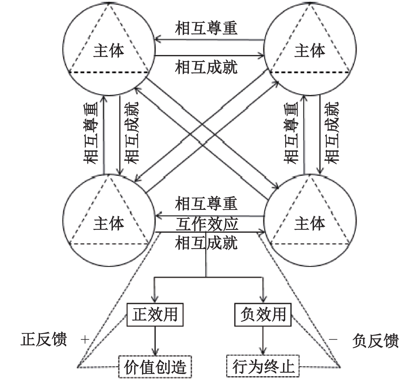 互作效应(interaction effect):价值放大的核心机制。互作效应是指多个主体之间相互作用、相互影响所产生的效应。在互为主体的关系模式中,主体之间建立起相互尊重、相互成就的合作关系,其中,每个参与者都将其他参与者视为主体和目的,而不仅仅是客体和工具,正如康德所强调的那样要平等对待人的尊严和价值(康德,2009)。这种关系超越了传统的上下级或控制与被控制的模式,强调主体间的平等、互惠和动态建构,由此也超越了传统零和博弈逻辑,转向促进系统间的能量转化和价值放大。这种效应不同于单个主体独立作用时的效果,它涉及主体间相互作用的复杂性和动态性。在共生关系中,互作效应既可能带来正向的协同效应(简称互作效用),也可能产生负向的冲突和阻碍,后者作为一种经验教训,构成反馈系统的一部分,从而有利于正效应的发挥。因此,需要特别关注主体间相互作用对整体的影响,辨析其正负效应,以便及时调整和优化共生关系。