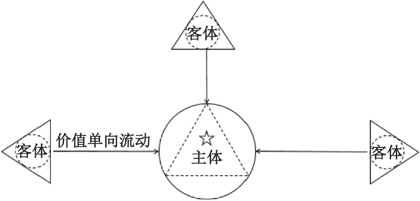 图3-1展示的是价值汲取过程,即在主体客体化的关系中,价值呈现单向流动的特征:主体通过控制效应(控制系统)从客体处汲取价值,形成明显的价值流动方向。图3-1中的五角星表示价值,单向箭头表示价值流动的方向,这展现了传统模式下价值从客体向主体的单向转移过程。这种模式本质上是一种零和博弈,主体的收益建立在客体的付出基础之上。