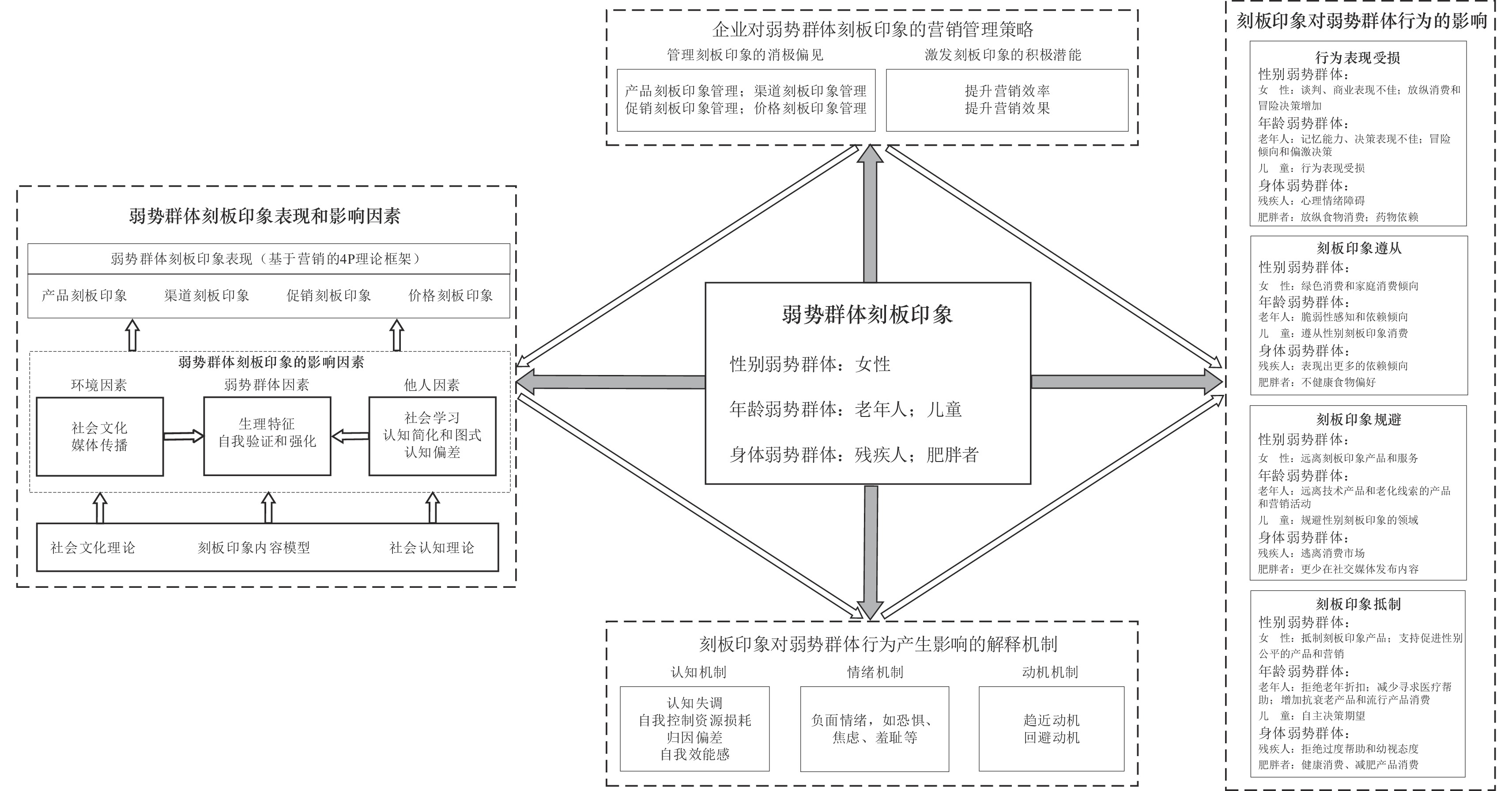 基于营销领域的4P理论框架,本部分系统梳理了消费市场中针对弱势群体的刻板印象表现,包括产品维度、渠道维度、促销维度和价格维度。然后,本部分分析了弱势群体刻板印象形成的三个影响因素:环境因素、他人因素和弱势群体的自身特征因素。