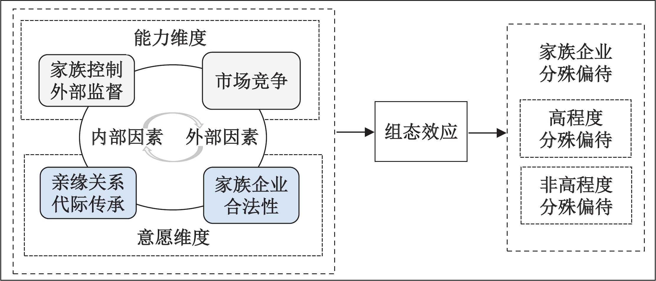 De Massis等(2014)提出“能力−意愿”框架,其认为控股家族的能力与意愿是决定家族企业是否展现出以家族为导向的独特行为的重要因素。分殊偏待作为家族企业独特的治理行为,是控股家族与内外部不同来源的治理力量及异质性目标互动的产物,仅存在优待家族成员的意愿或能力,都难以导致高程度分殊偏待的产生。