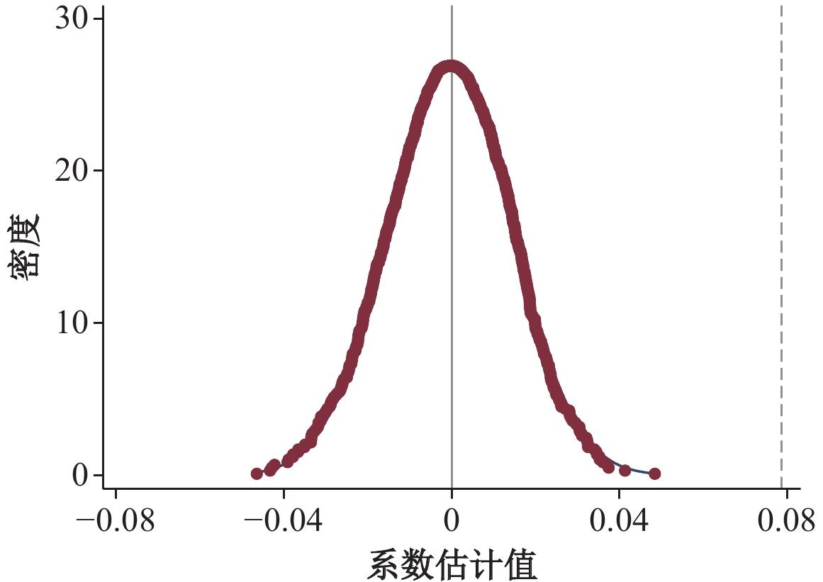 2.安慰剂检验。为了排除可能存在的遗漏变量偏误和其他竞争性解释,借鉴Ferrara等(2012)的处理思路,采用随机分配处理组的测试方法作安慰剂检验。具体而言,本文在全部企业中随机抽取特定数量的企业作为“伪处理组”,并确保“伪处理组”中的企业数量与实际处理组中的企业数量相等。接着,构建“伪处理组”哑变量以及对应的“伪产融合作试点”变量,并在此基础上重新对模型(14)进行参数估计,得到“伪产融合作试点”变量的参数估计结果。重复上述过程